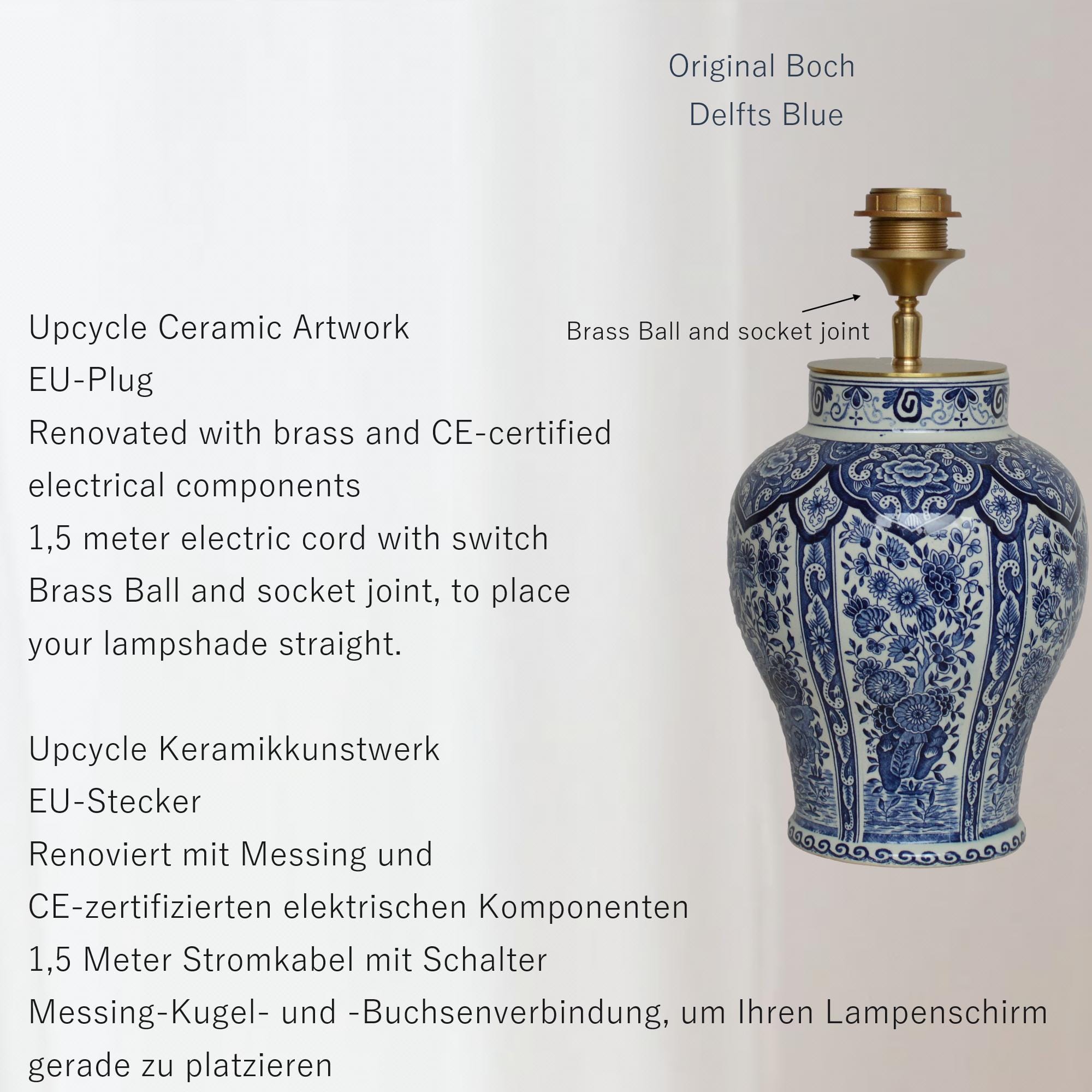 De keramische basis stamt uit de periode 1969–1979 en draagt het originele merkteken “Made for Royal Sphinx by Boch, Delfts” aan de onderzijde. De decoratie is aangebracht met behulp van transfertechniek, waarmee fijne motieven op het oppervlak zijn aangebracht in een intens diepblauwe tint. Deze specifieke kleurstelling is kenmerkend voor het Delfts geïnspireerde aardewerk uit die periode en maakt elk exemplaar uniek.