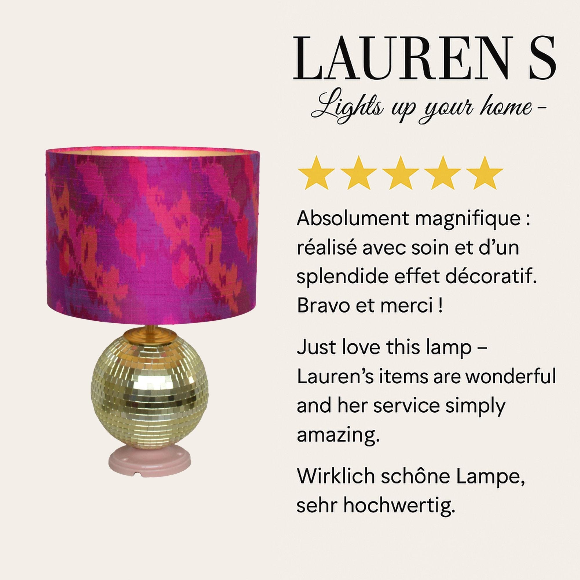De porseleinen basis in zachtroze heeft een vintage uitstraling die warmte en elegantie toevoegt. Daarboven rust een discobal van 15 cm doorsnede, bezet met kleine goudkleurige spiegelstukjes die het licht op subtiele wijze reflecteren. De kap is vervaardigd van wilde zijde uit India en toont een ingetogen ikat-patroon in tinten fuchsia, paars en terra. De goudkleurige binnenzijde zorgt voor een warme lichtverspreiding.