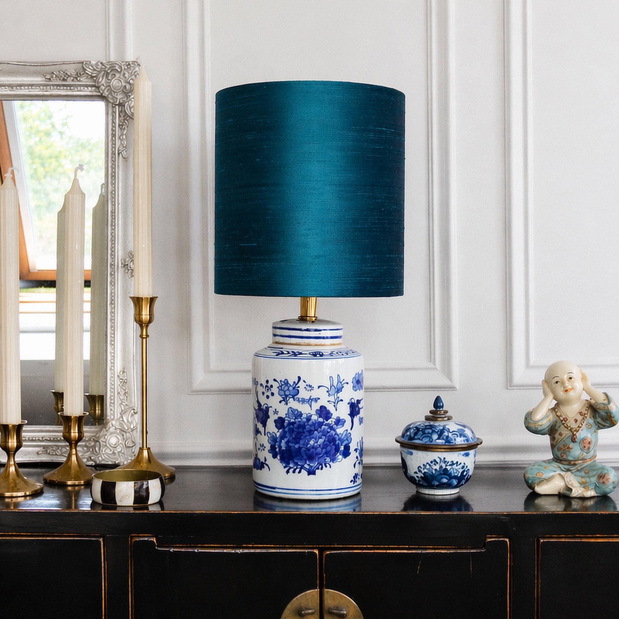 Deze lampenvoet van Chinees porselein brengt karakter en diepte in het interieur. Het gedetailleerde blauw-witte oppervlak en de klassieke vorm zorgen voor een rustige maar aanwezige uitstraling. Daardoor combineert de lamp moeiteloos met antiek meubilair, moderne kunst en rijke stoffen. Ook op een dressoir, console of nachtkastje vormt deze lamp een verfijnd accent.