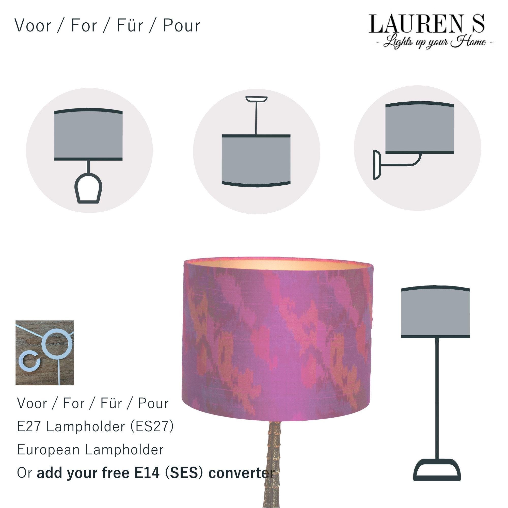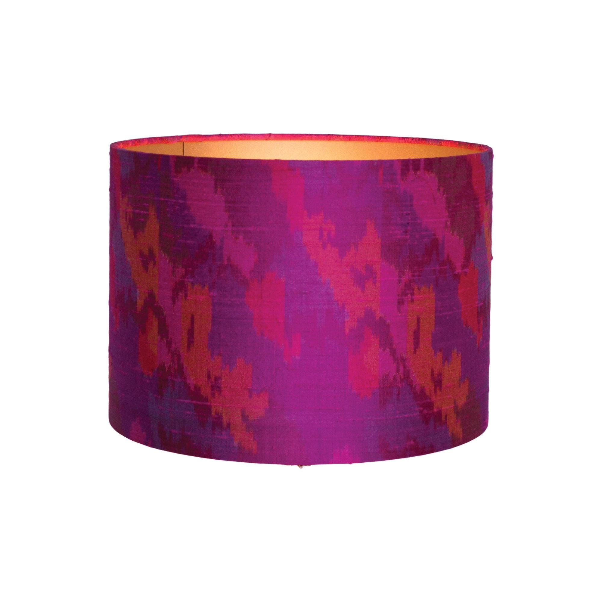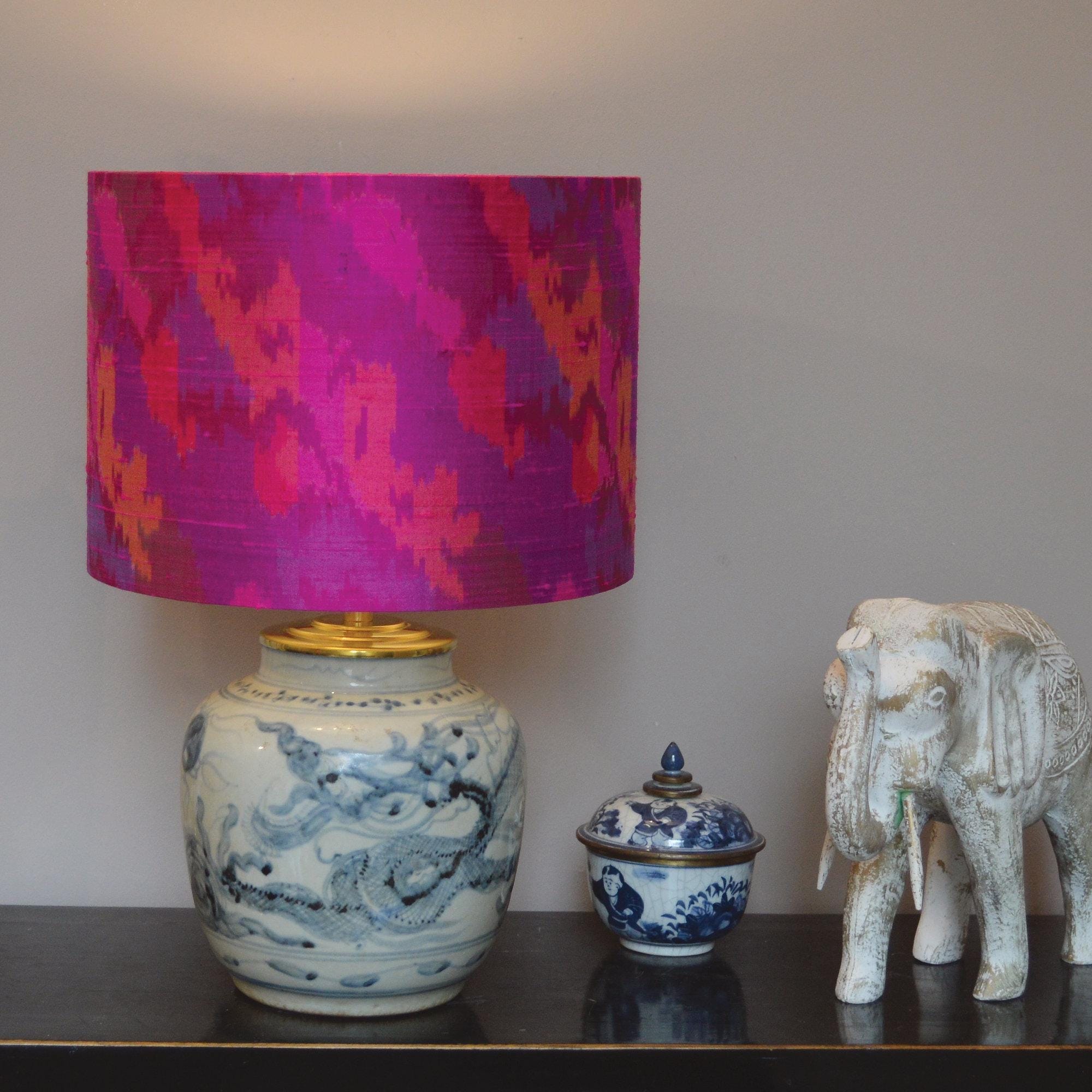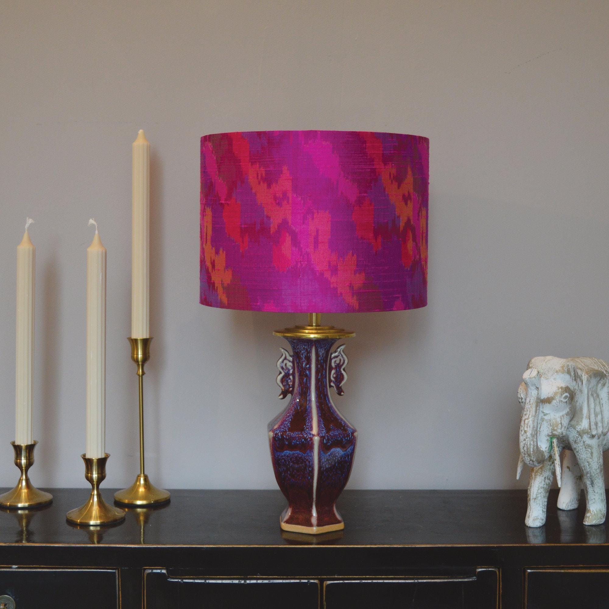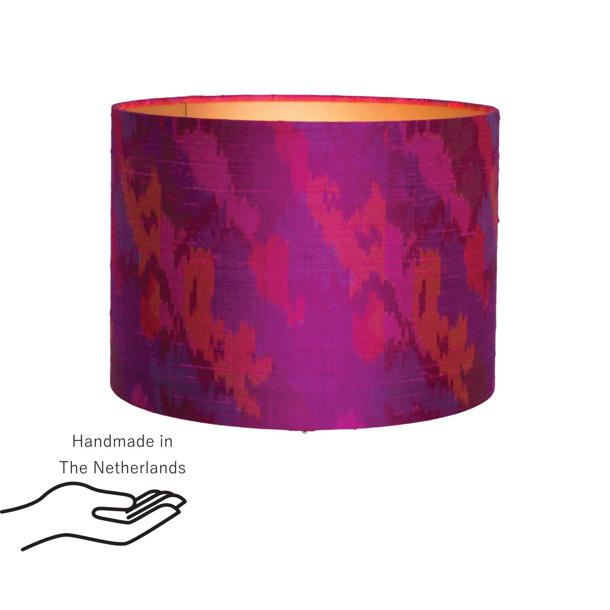 Deze handgemaakte lampenkap van wilde zijde valt op door haar levendige kleurenpalet en rijke textuur. De traditionele, handgeweven zijde uit India is uitgevoerd in diepe fuchsia met helderroze en warme terra accenten. Door het natuurlijke changeant effect van de stof ontstaat een subtiele paarse gloed, afhankelijk van het licht en de kijkhoek. Dit maakt elke lampenkap visueel dynamisch en bijzonder elegant.