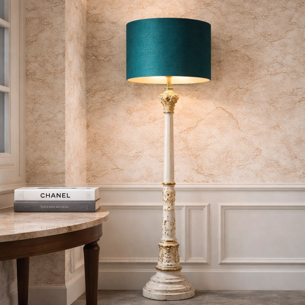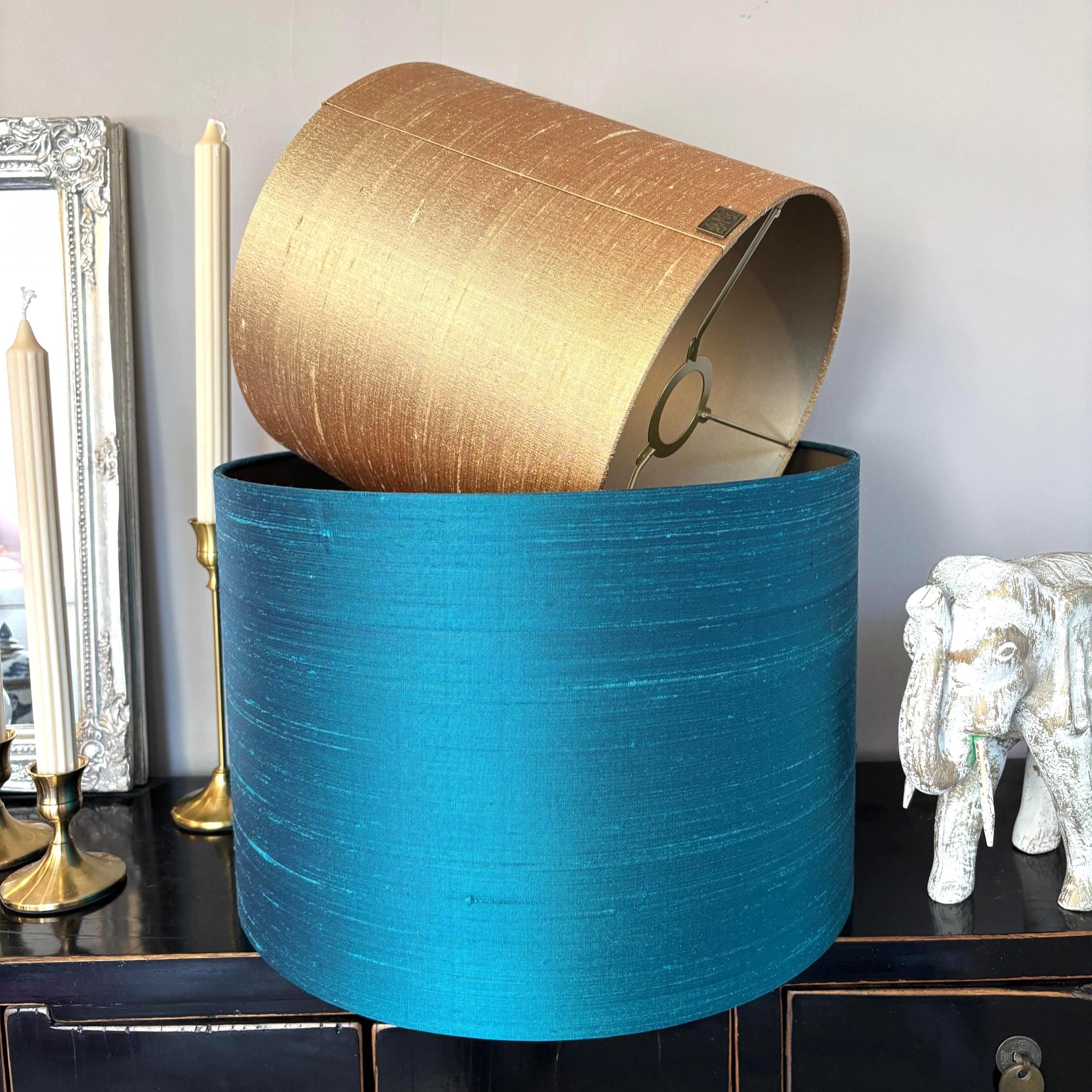Deze lampenkap teal zijde is ontworpen voor interieurs waarin kleur een bewuste rol speelt en materialen met zorg zijn gekozen. De tint beweegt tussen teal, petrol, verdigris en aqua groen en heeft een rustige diepte die zich moeiteloos laat combineren met zowel lichte als donkere interieurs. De kleur voelt rijk en gelaagd, zonder te domineren. Juist daardoor is deze lampenkap geschikt voor ruimtes waar sfeer, balans en verfijning centraal staan.