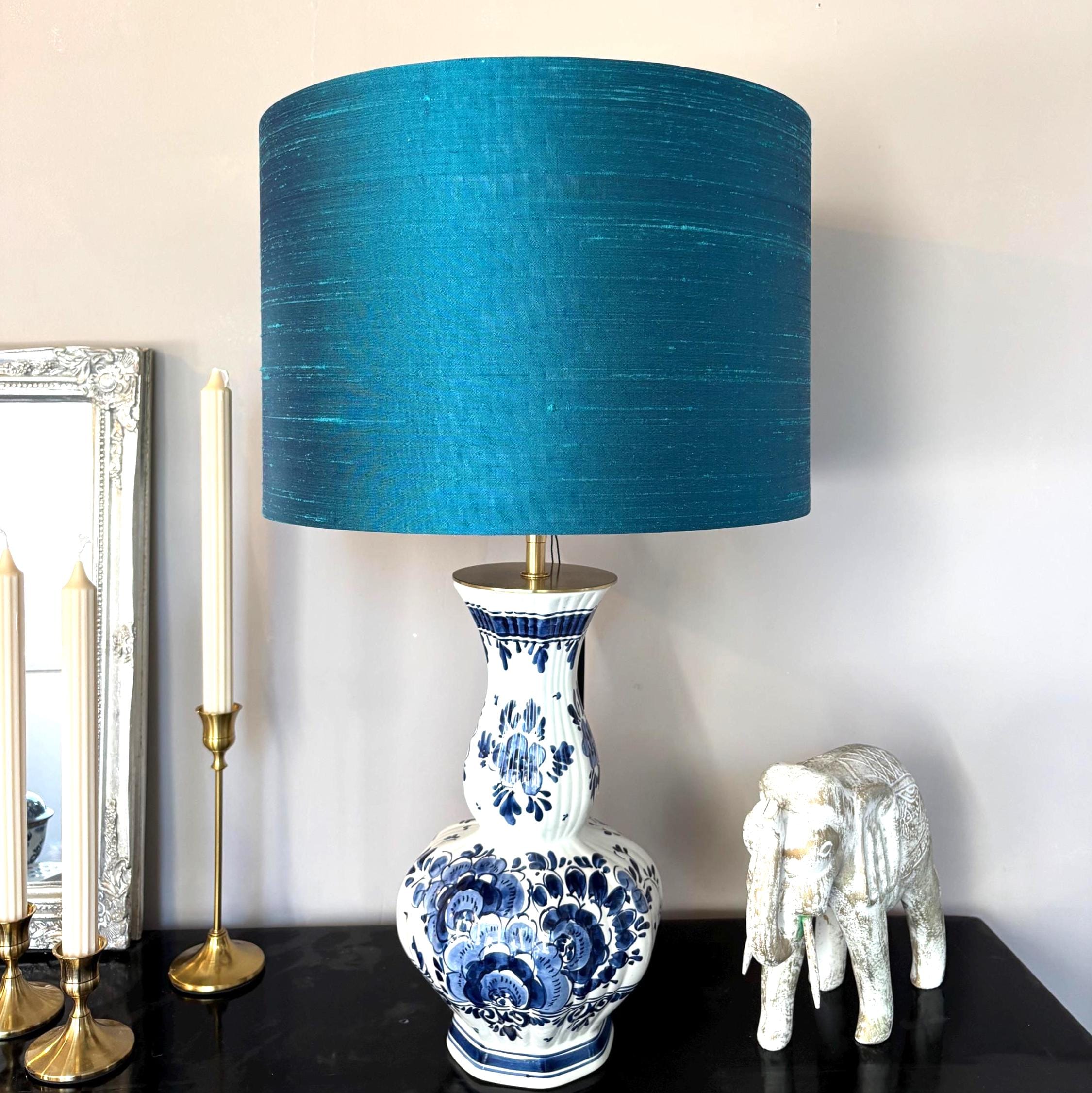 In mijn werk zie ik verlichting als een bijzonder verlengstuk van het interieur. Een lampenkap verbindt meubels, kleuren en materialen en bepaalt voor een groot deel de sfeer in een ruimte. Deze lampenkap teal zijde laat zich prachtig combineren met messing, keramiek, hout en natuursteen. Denk aan een klassieke lampenvoet, een vintage vondst of juist een strak vormgegeven armatuur voor contrast.