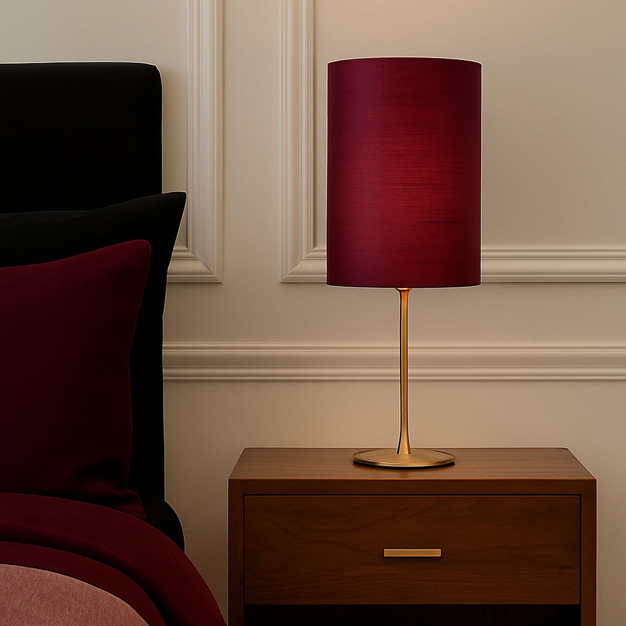 Deze hoge, smalle lampenkap is vervaardigd uit donkerrode wilde zijde en kenmerkt zich door een elegante, langwerpige vorm. De cilindrische kap is ontworpen voor toepassing in interieurstijlen waar rust, eenvoud en verfijning centraal staan, zoals klassiek, Haussmann-geïnspireerd, mid-century, eclectisch of minimalistisch design. De aubergine kersen rode kleur biedt een warme, natuurlijke uitstraling die zowel bij neutrale als rijke kleurpaletten aansluit. De lichte zijdeglans van het materiaal zorgt voor een subtiel spel van licht en textuur, waardoor de lampenkap visuele diepte geeft zonder dominant aanwezig te zijn.