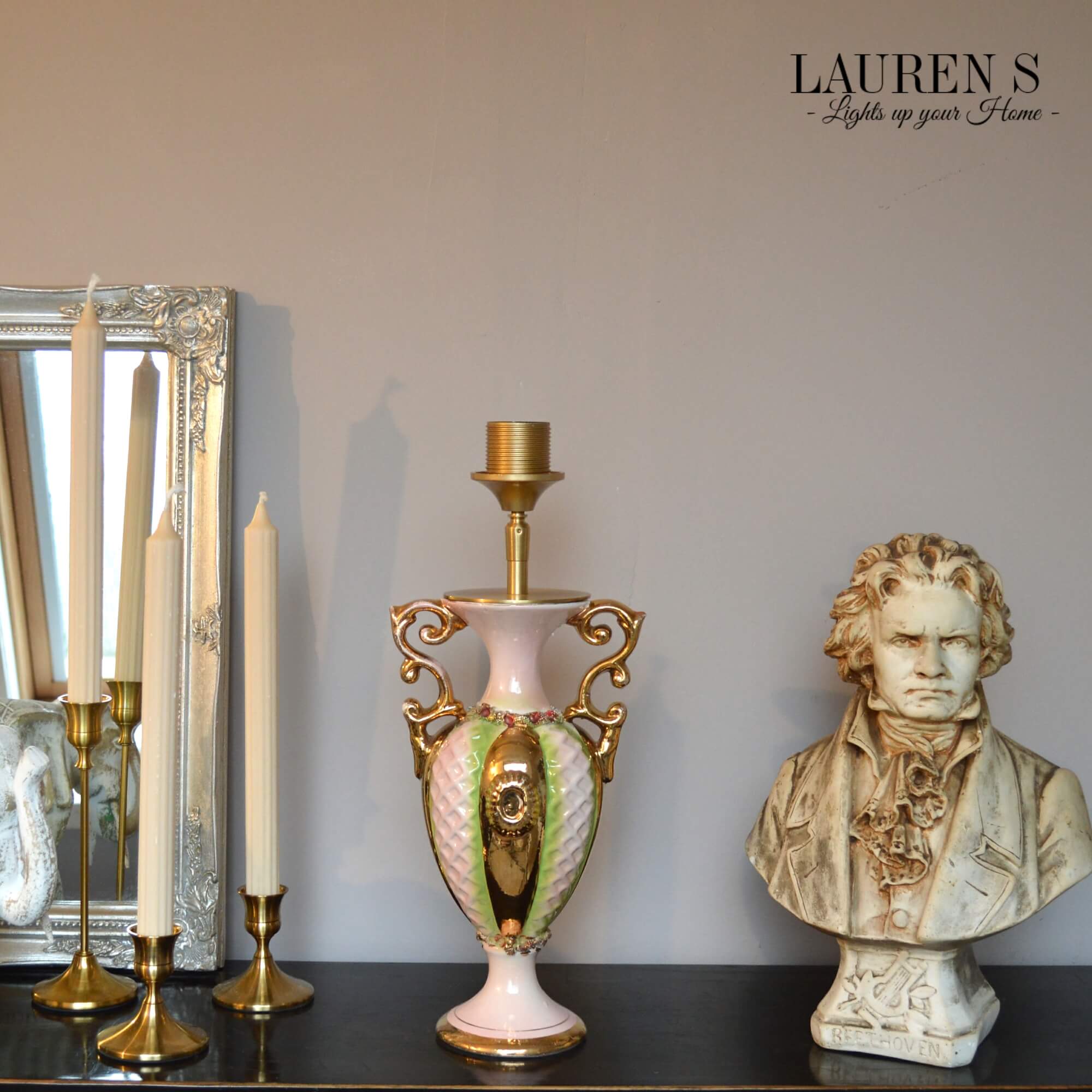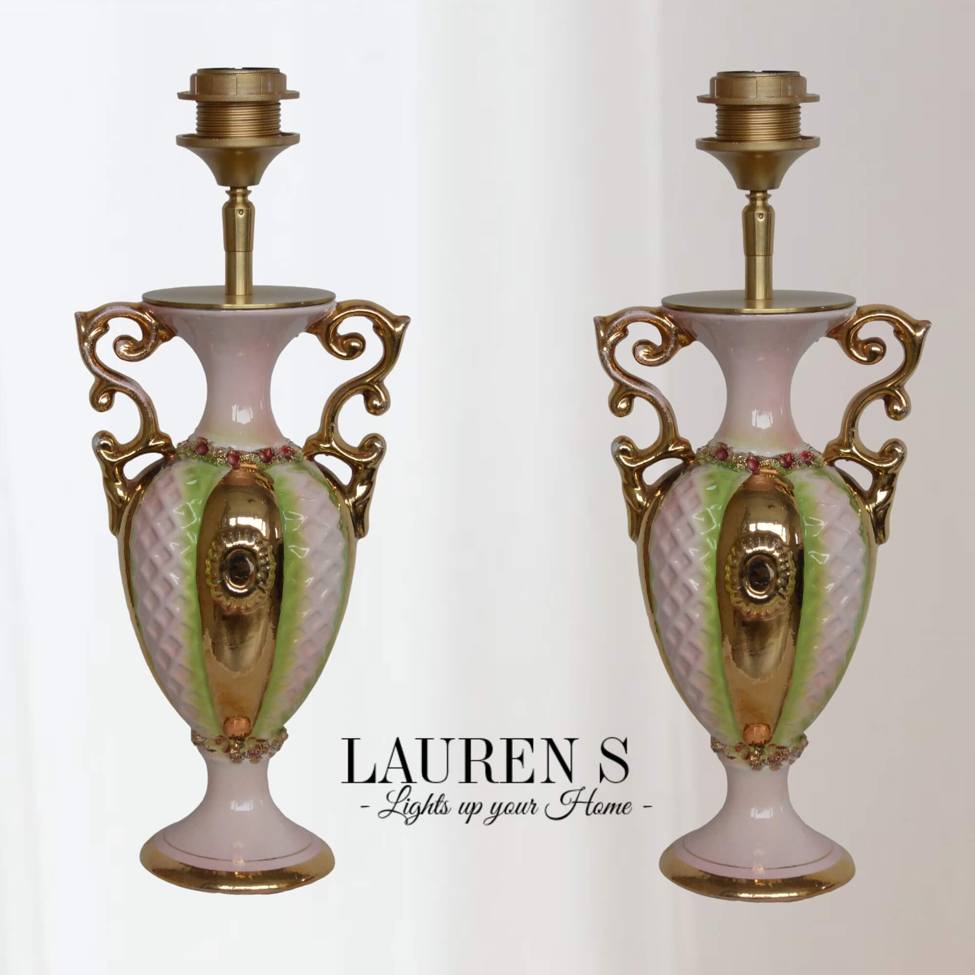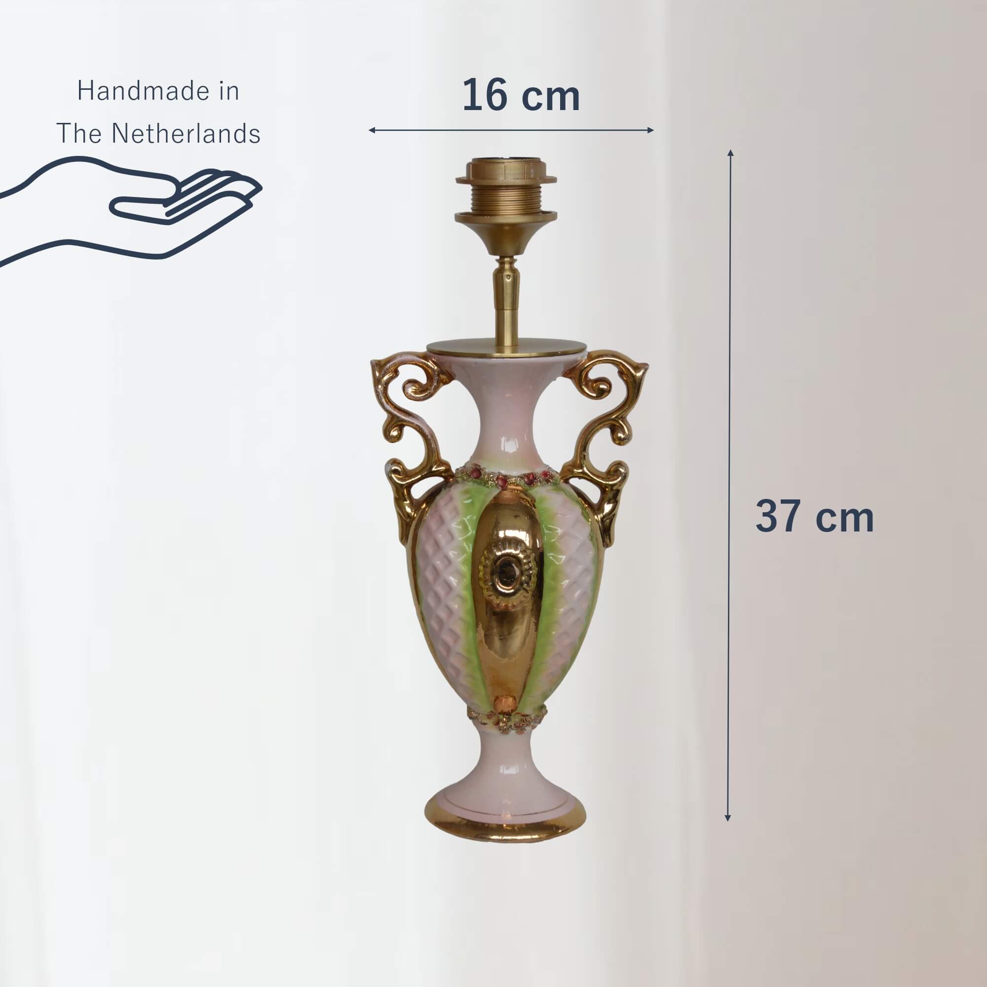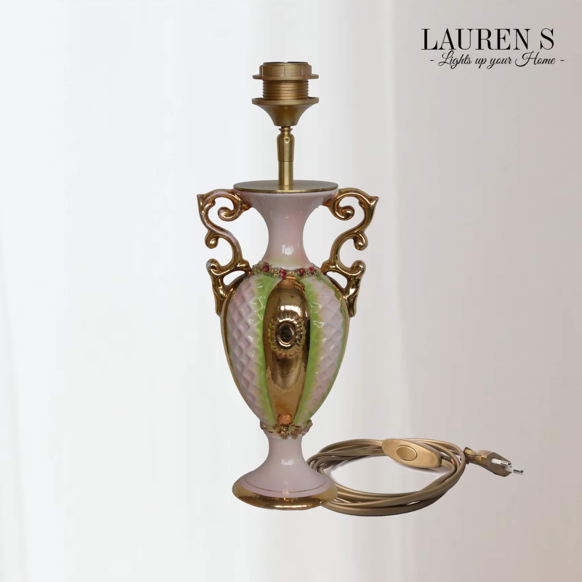 Ik ben verliefd op de unieke charme van deze bijzondere lampenvoet. Vervaardigd uit een Italiaanse vintage vaas van C.A.L. Lucca, ademt deze lampenvoet Italiaans design elegantie en historie. De vaas, vermoedelijk uit de jaren ’50 tot ’70, is met de hand beschilderd met goud en heeft een sierlijk decoratief ontwerp dat tijdloos past binnen luxe interieurs.