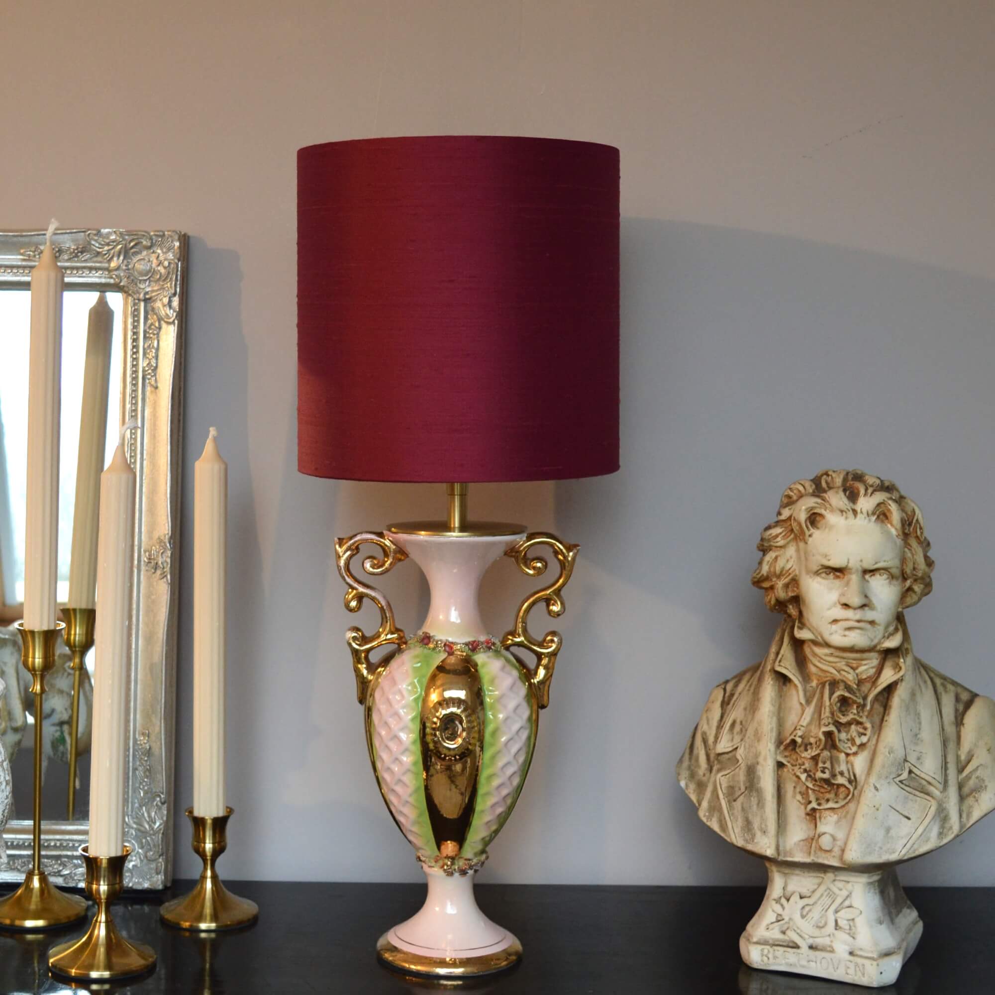 • Stijl: Vintage keramiek met handgeschilderde roze, groene en gouden details