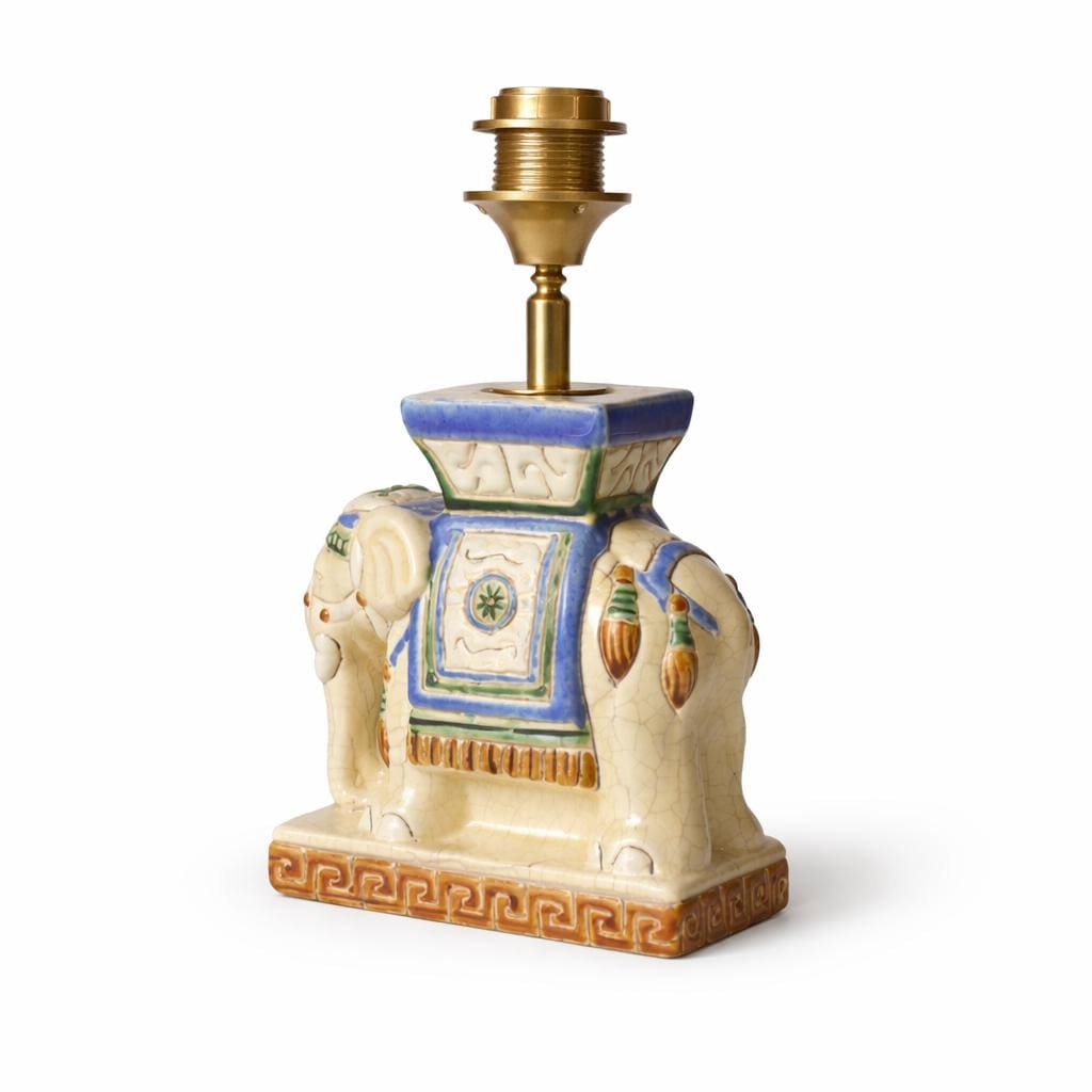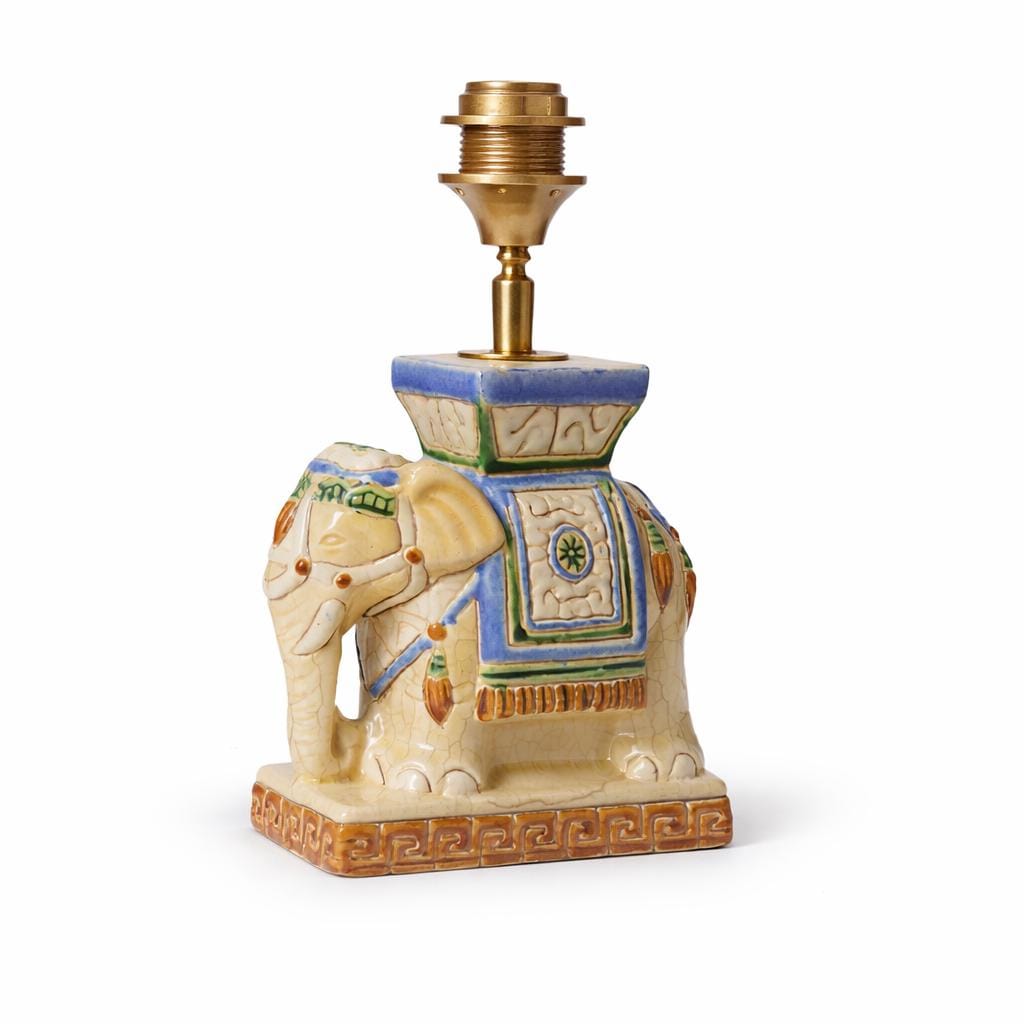 Olifant vintage lamp, een charmante keramieken olifant als lampenvoet combineert met nieuwe messing onderdelen. De lamp is met zorg en vakmanschap vervaardigd in mijn lampenatelier in Vianen, Nederland.