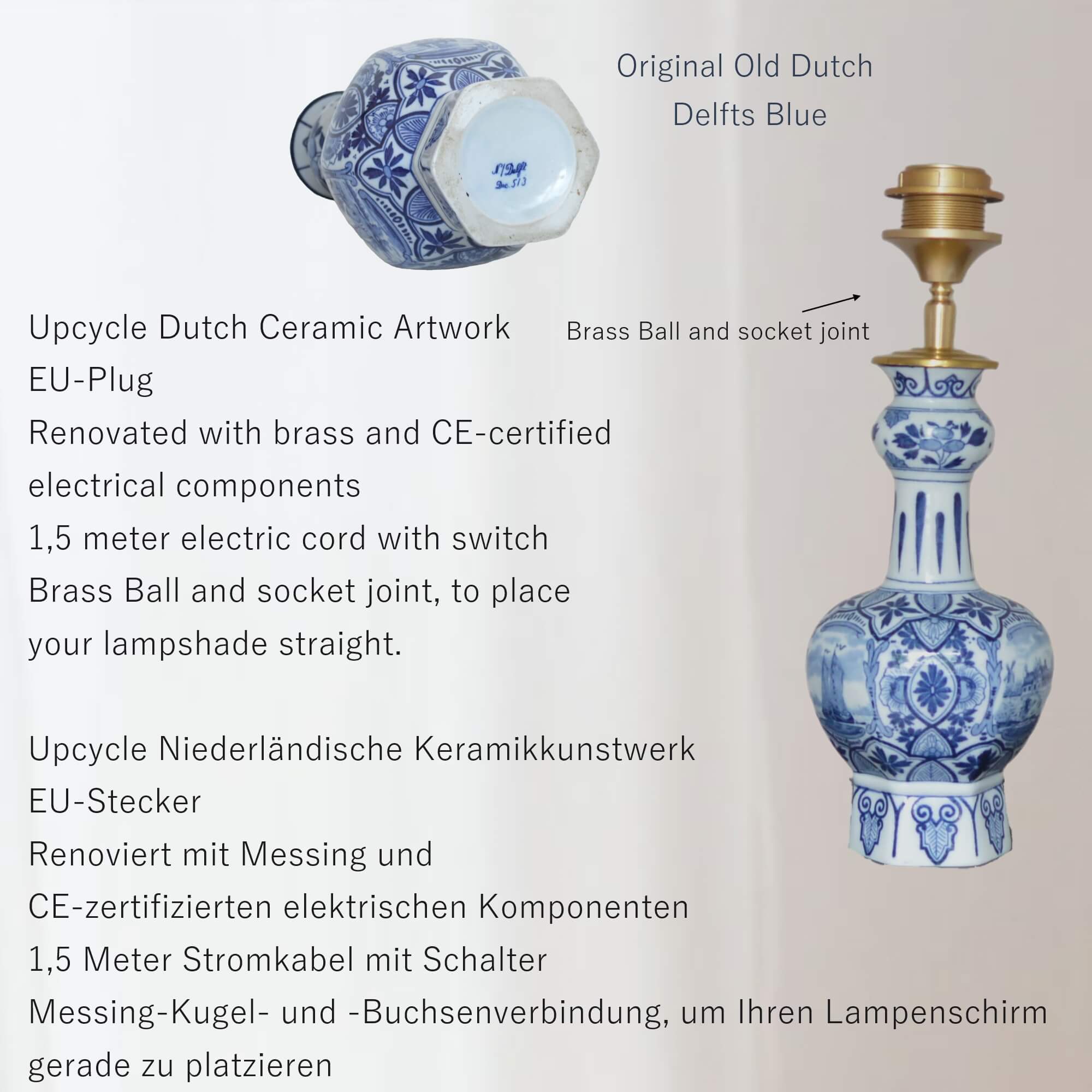 De antieke lampenvoet, vervaardigd uit een originele Delftsblauwe vaas, is afgewerkt met nieuw messing. Deze hoogwaardige afwerking zorgt niet alleen voor een moderne touch, maar garandeert ook de duurzaamheid van de lamp, zodat je er jarenlang van kunt genieten. Elk exemplaar van deze lamp is uniek – er is geen tweede zoals deze. Dit maakt jouw lamp tot een exclusief kunstwerk in je interieur, perfect voor wie op zoek is naar een statement lamp met een rijke geschiedenis.