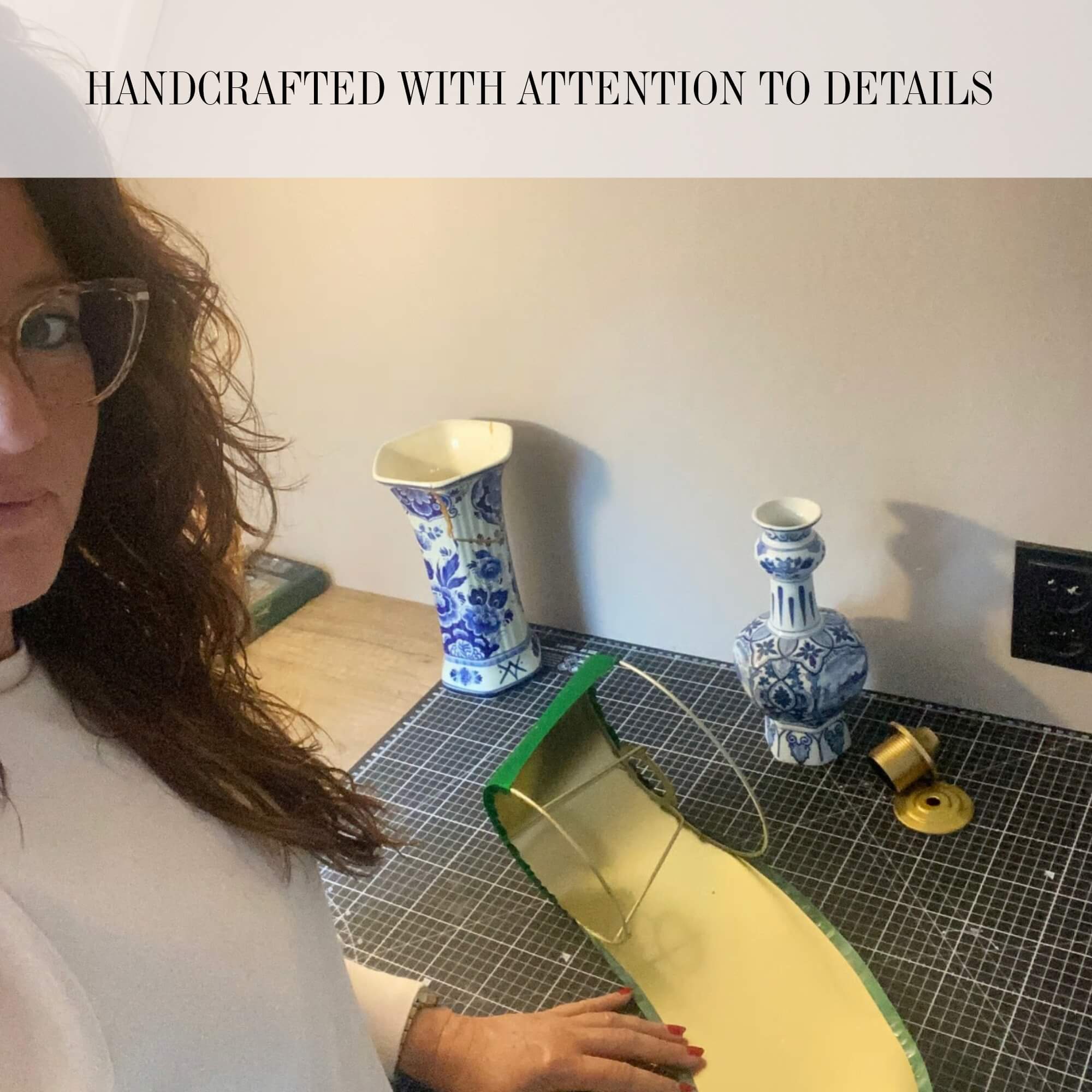 De lampenkap, met een diameter van 20 cm, is gemaakt van luxe groene shantung zijde, rechtstreeks uit India geïmporteerd. Deze hoogwaardige stof voegt een element van verfijning toe aan de lamp, terwijl de glanzend gouden binnenkant een warme, uitnodigende gloed verspreidt in elke kamer. De keuze voor groen en goud creëert een contrastrijke en harmonieuze combinatie, waardoor de lamp zowel klassiek als eigentijds oogt.