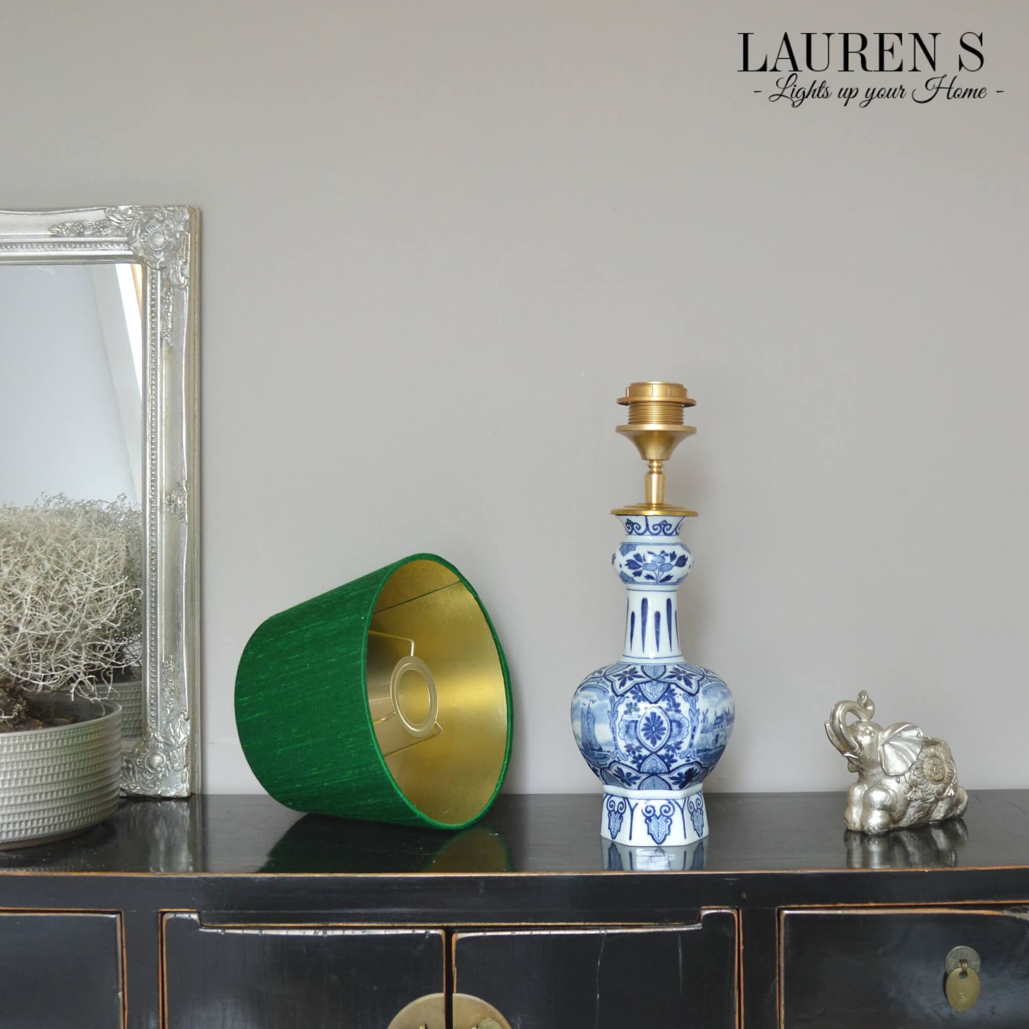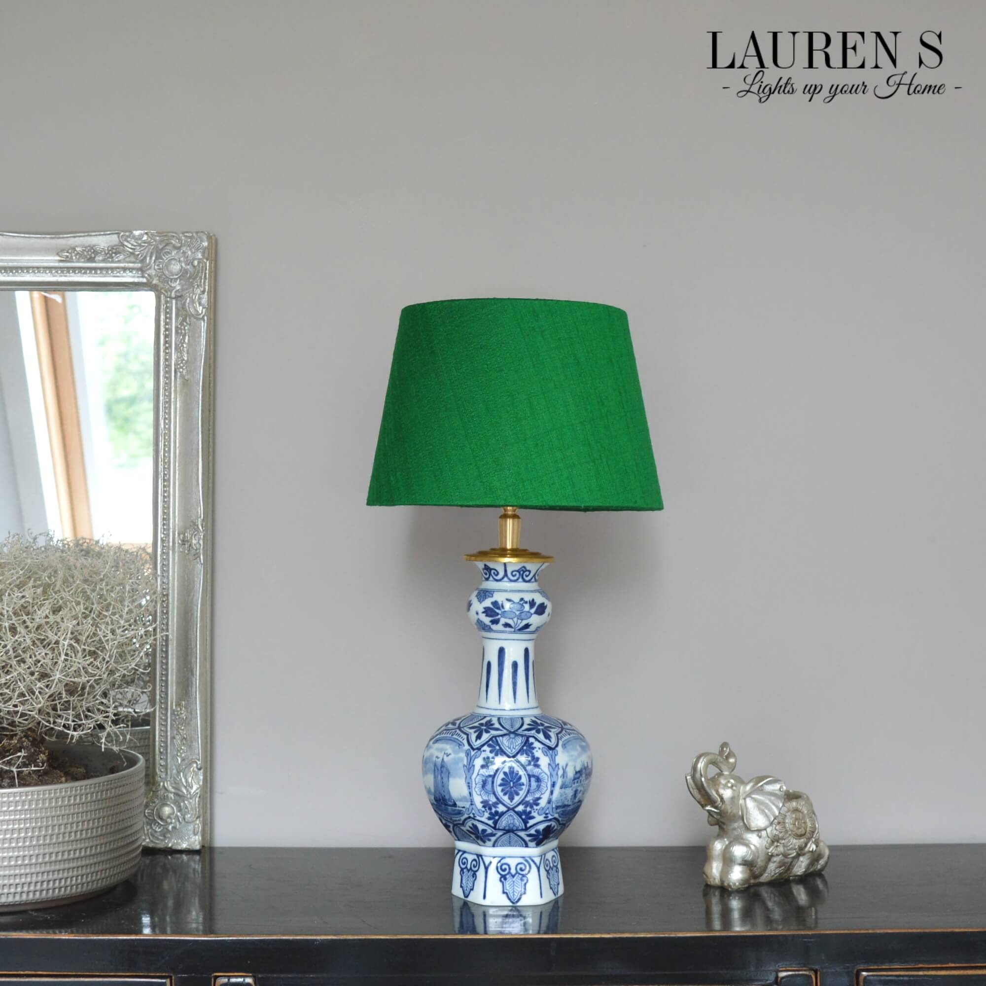 Deze tafellamp in blauw en groen is veelzijdig genoeg om in verschillende ruimtes te gebruiken. Plaats hem op een nachtkastje in de slaapkamer voor een serene, luxe uitstraling, of gebruik hem als bureaulamp om een stijlvolle werkomgeving te creëren. Met zijn prachtige combinatie van Delfts Blauw en groene shantung zijde, voegt deze lamp een vleugje Nederlandse elegantie toe aan elke ruimte waarin hij staat.