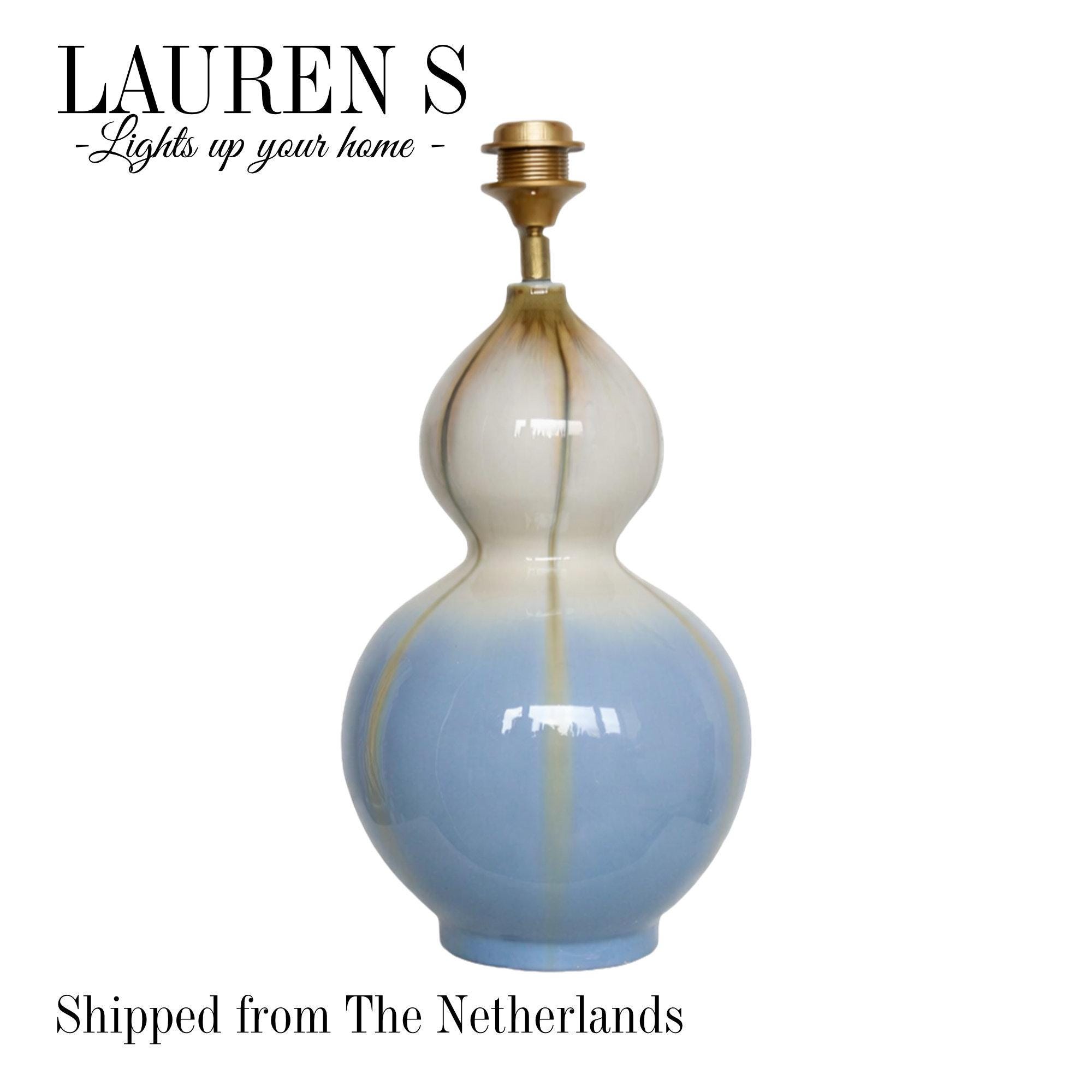 Tafellamp in blauwe keramiek met een elegante gourd vorm. Het keramiek is afgewerkt met een glanzende glazuurlaag in zachte tinten crème en blauw, ietswat oudroze en mosterd geel, waardoor een subtiel kleurverloop ontstaat. Deze moderne lampenvoet voegt rust, vorm en karakter toe aan een interieur en is een perfecte keuze voor wie op zoek is naar unieke verlichting. Het ontwerp is zowel eigentijds als tijdloos, geschikt voor een woonkamer, slaapkamer of stijlvolle werkplek. Elke lamp is met de hand vervaardigd in mijn atelier en draagt het unieke karakter van ambachtelijk keramiek.