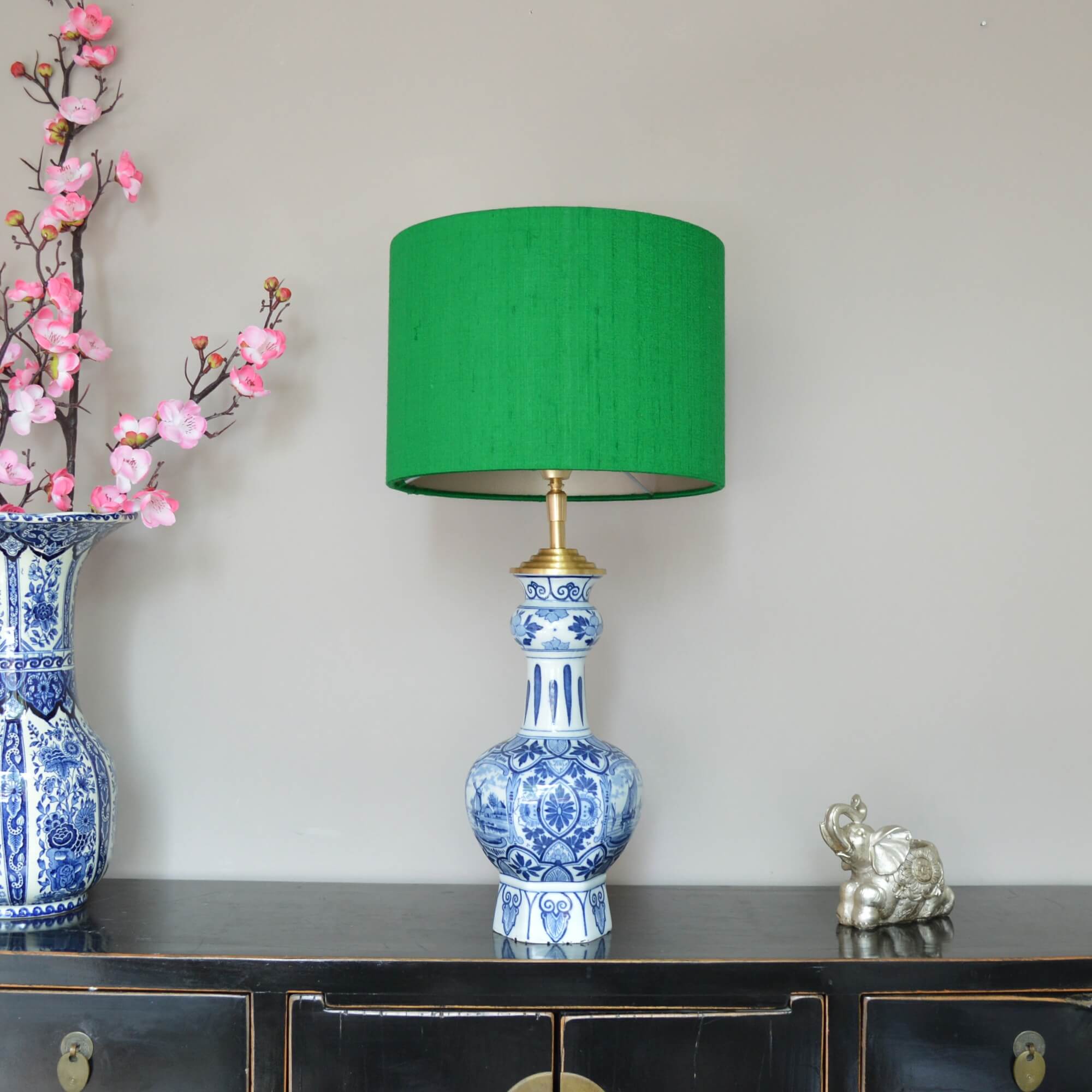Breng een vleugje Nederlandse charme in je high-end interieur met mijn unieke Delftsblauwe tafellamp, nu compleet met een groene zijden lampenkap. Deze lamp is niet alleen een functionele lichtbron, maar ook een prachtig kunstwerk dat een warme sfeer creëert in elke ruimte.