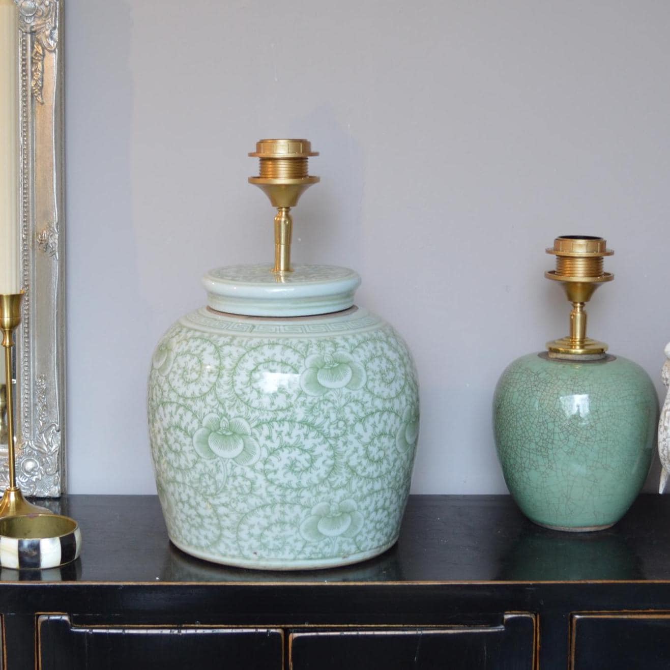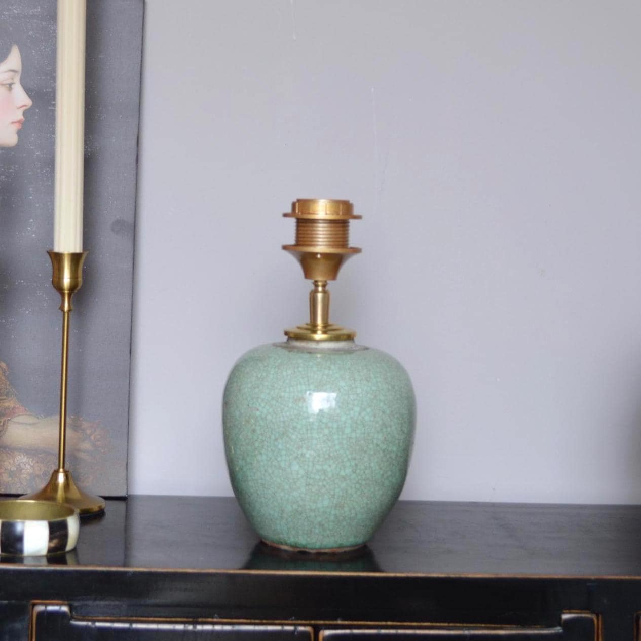 Gemberpot lamp in antiek groen craquelé keramiek, deze bolvorm lampenvoet is vervaardigd uit Chinees keramiek met een opvallende craquelé glazuurlaag in jade groen tint. De klassieke vorm van de gemberpot krijgt een moderne uitstraling door de combinatie met het glanzende messing en de gouden fittings. Deze tafellamp is een stijlvolle toevoeging aan een modern antiek interieur en laat zich uitstekend combineren met klassieke elementen, natuurlijke materialen en rijke stoffen.