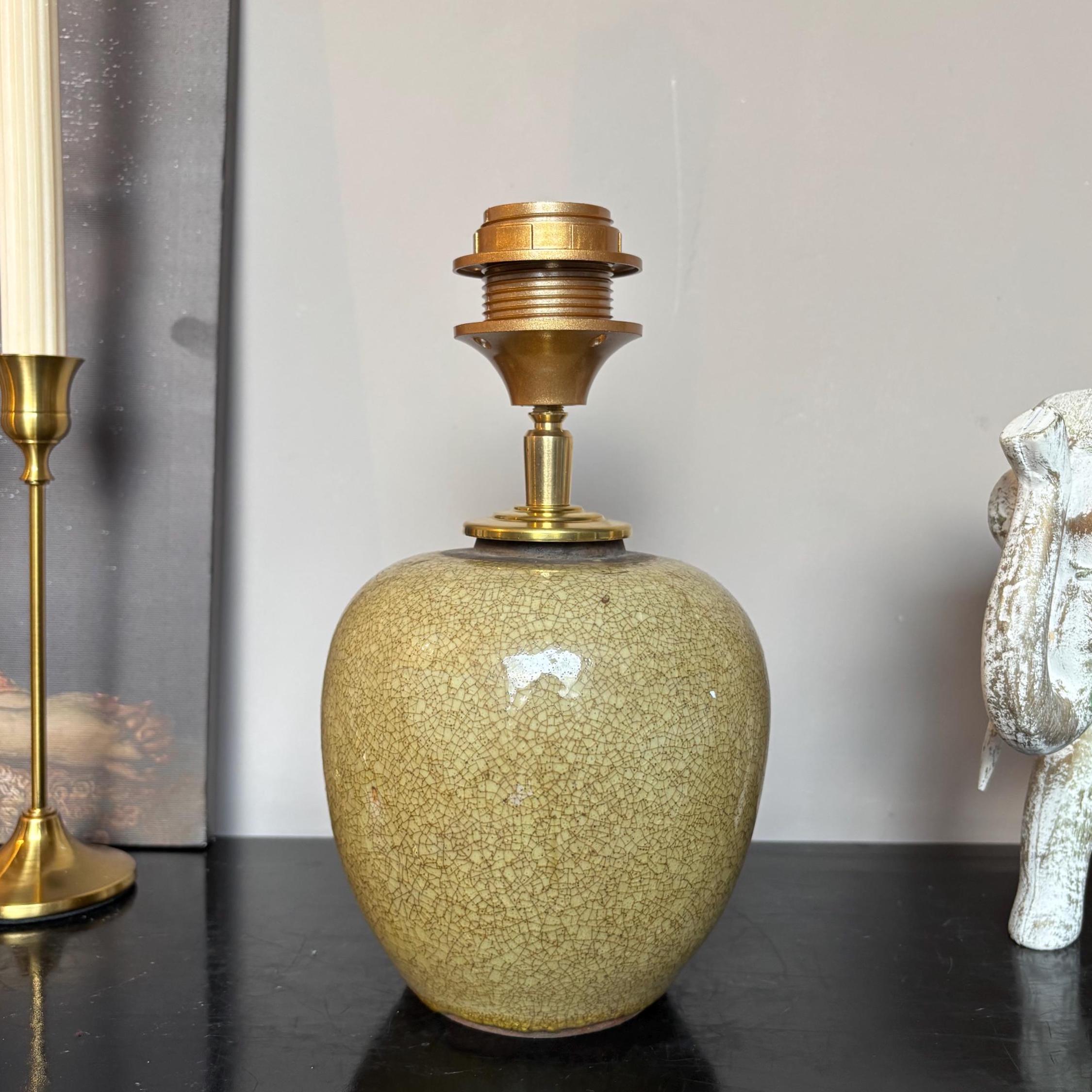 Gemberpot lamp in oker geel craquelé keramiek, deze elegante lampenvoet is vervaardigd uit Chinees keramiek met een opvallende craquelé glazuurlaag in warme okergele tint. De klassieke vorm van de gemberpot krijgt een moderne uitstraling door de combinatie met het glanzende messing fittingssysteem. Deze tafellamp is een stijlvolle toevoeging aan een modern klassiek interieur en laat zich uitstekend combineren met antieke elementen, natuurlijke materialen en rijke stoffen.