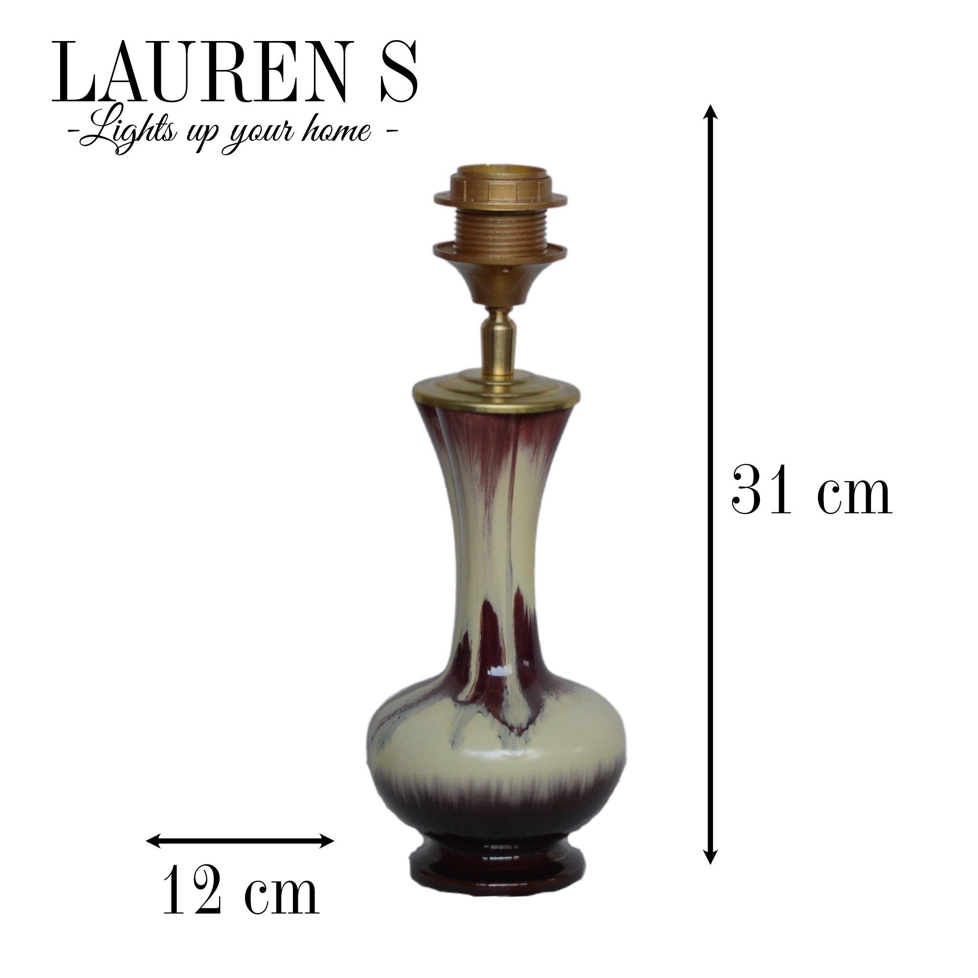 Elke lampenvoet in mijn collectie is met zorg samengesteld in mijn atelier. Ik werk met originele vintage vazen uit bijvoorbeeld de jaren 60 en 70, waarbij ik let op vorm, kleur en glazuurkwaliteit. Door het ambachtelijke karakter is geen enkele vaas exact gelijk, waardoor elke lamp een uniek karakter heeft. Het rijke glazuur met donkerrode en beige tonen vloeit op natuurlijke wijze over het keramiek en vangt prachtig het licht.